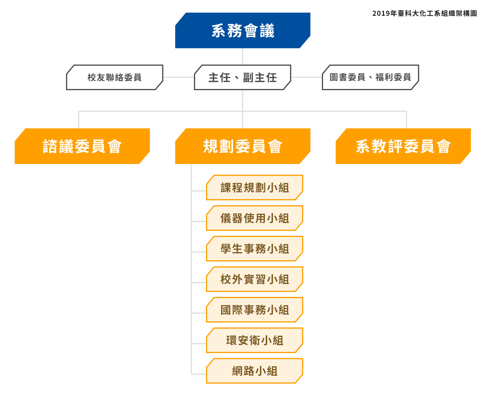 本系之組織架構,如下圖,本系系務會議為系務議決最高機關,並分設教師評審委員會、諮議委員會、規劃委員會,其中,規劃委員會下設置課程規劃小組、學生事務小組、儀器使用暨規劃小組、環境安全衛生小組、國際事務小組與網路及計算機小組,各委員會依其權責各司其職,另有圖書委員、福利委員、校友聯絡委員等,協助系務順利推展。